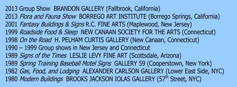 Loving repetition in the arts I always produce objects with a theme or genre: beginning in 1976 my vernacular architectural models of the American roadside, began as a ribbon of carefully lit models along a Masonite roadway, positioned in a gallery space filled with sand: aha! Phoenix from the air, 1937. The models evolved into the purity of their signage, which then detoured to derivatives of the American flag. Still a mystery to me, perhaps fueled by a visit to an aquarium, I began to make fish, all sizes and shapes, always full of color. The Salton Sea, which should interest all of us who live in this broad region, also fuels the notion that given enough time, its stock of fish might morph into some of the vividly bright examples I produce. Moving to California in 2008 from Connecticut, I returned “home” to cars, my first and greatest love. As a sidebar to them I also build robots from scrap sheet metal, industrial gauges, and plumbing parts. I freely appropriate ideas from book illustrations, car magazines from the 1950’s to the present, and visits to the many hot rod and “kustomized” car shows in Southern California (with stops at aquariums to catch up on fish). Color is critical to me. I study and experiment freely. My work might best be described as carefully contrived folk art, with critical attention to proportion and color.